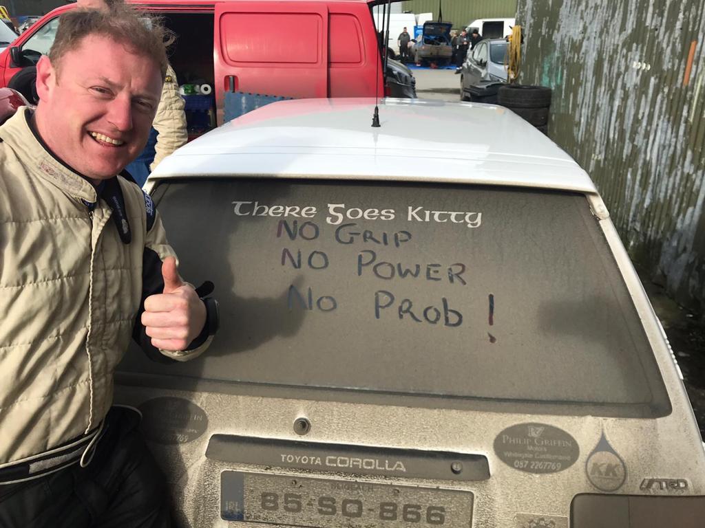 The Circuit of Kerry clerk of the course made hard work of his day. An off-road excursion on the second loop needed the help of spectators to re-join the course. He stopped again on the final stage when the exhaust manifold came lose and jammed itself between the engine and sump guard. Daughter Ciara made her rally debut.