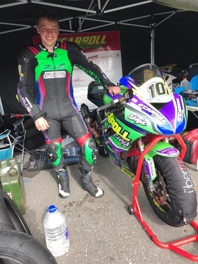 After a season at Mondello he made is his road racing debut at the delayed Cookstown 100 in September, riding his newly acquired Kawasaki 600, O’Carroll took ninth overall in the Combined Senior Support A and B race and finished second in class B.