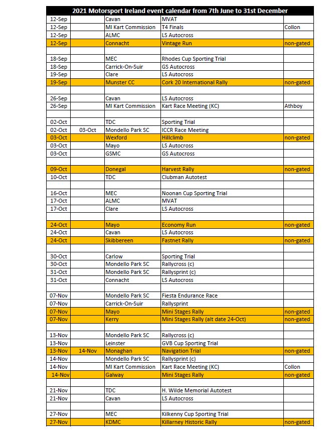Following a meeting with affiliated clubs on Saturday, May 29, Motorsport Ireland has issued a calendar of events for the remainder of 2021.
