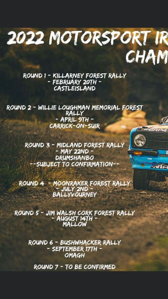The championship also includes the Carrick on Suir Forestry (April 9); a new rally run by the Midlands Motor Club(May 22); the Moonraker Forestry Rally (July 2) the Cork Forestry Rally (on August 14) and the Bushwhacker Rally in Tyrone on September 17.