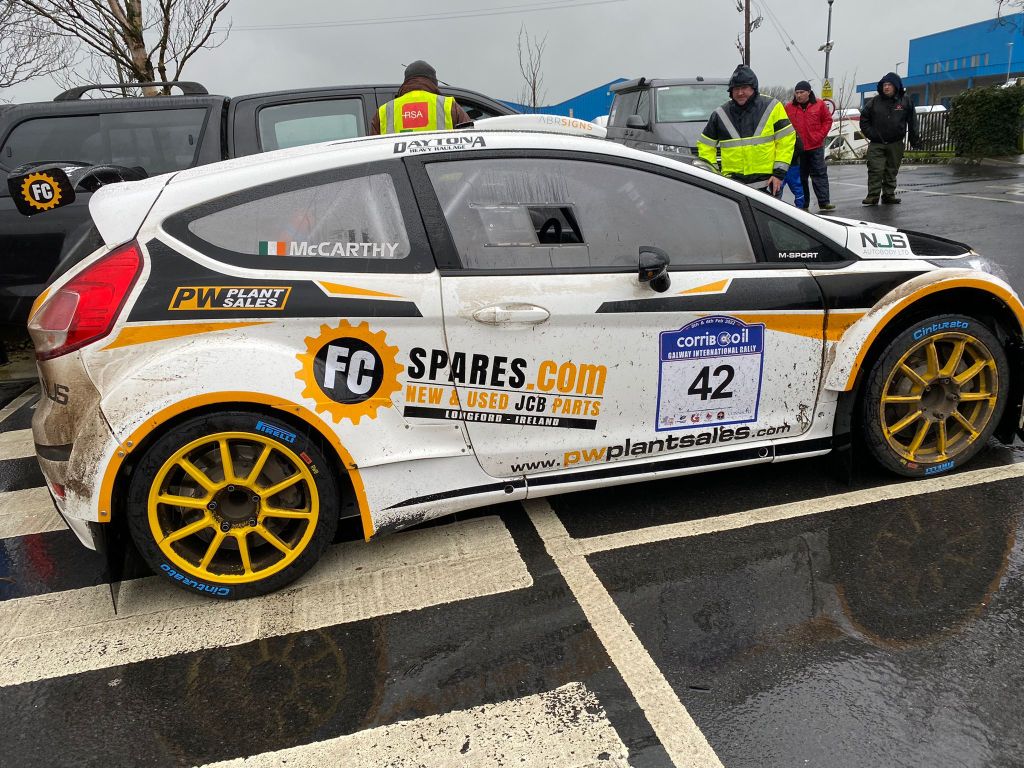 Another John McCarthy, also from Killcummin is alongside Peter Wilson and they are 16th overnight on their Ford Fiesta Rally2. Steamed up windows were their biggest troubles today.