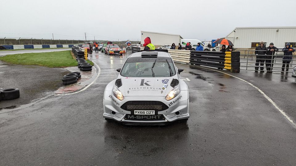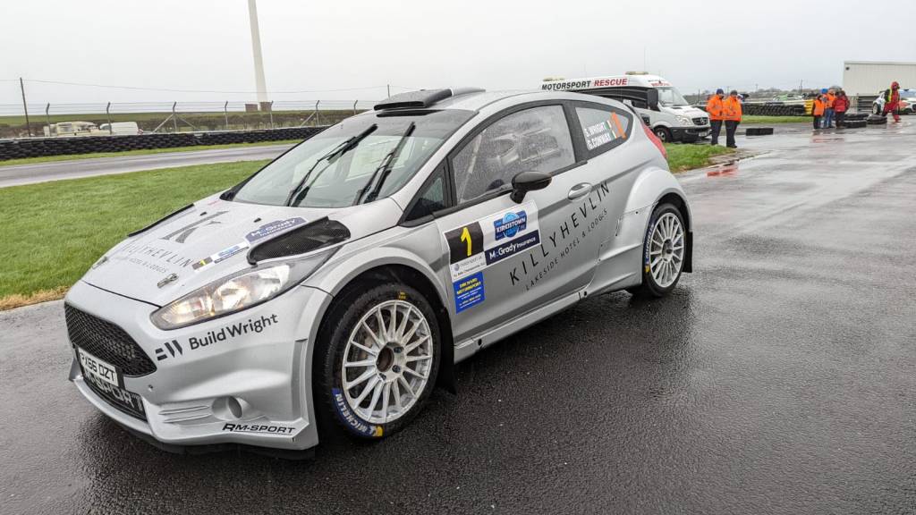 Despite losing a couple of seconds off the start line, Stephen Wright and Ger Conway grabbed the early lead after the opening stage of the Orchard Motorsport Kirkistown Stages Rally. As the rain fell on the County Down venue, they were inch-perfect through the wet test to set fastest time by 1.4 seconds from Jonny Greer and Darragh Mullen.
