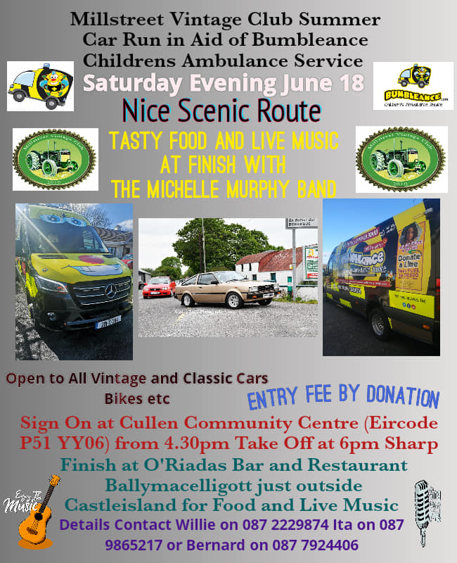 Millstreet Vintage Club’s Summer Car Run will finish at O’Riada’s Bar in Ballymac this Saturday evening.