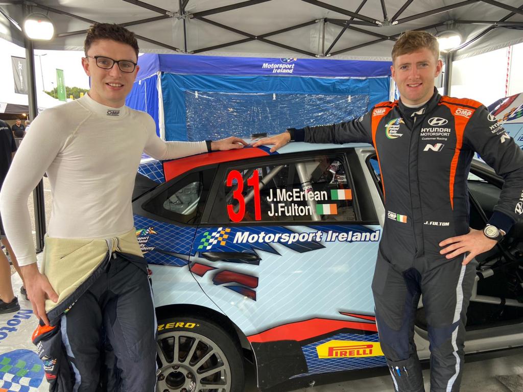 Josh McErlean and James Fulton have their eye on a bigger prize. Cavan man Fulton could win the WRC2 Junior co-driving title this weekend and that remains on target after they finished the day in 20th position and overall and their main title rivals Grégoire Munster and Louis Louka one place behind.