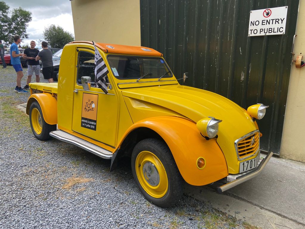 Several other classics were there too, but one caught my eye. It was a Citroen 2CV decked out in the official livery of the 2018 Tour de France, advertising that the town of Quimper was hosting a stage finish that year.
