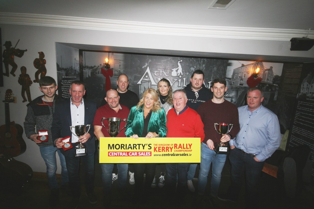 Caption: Moriarty’s Central Car Sales Kingdom of Kerry Rally Championship prize winners at the awards presentation at the Anvil Bar over the Christmas period.