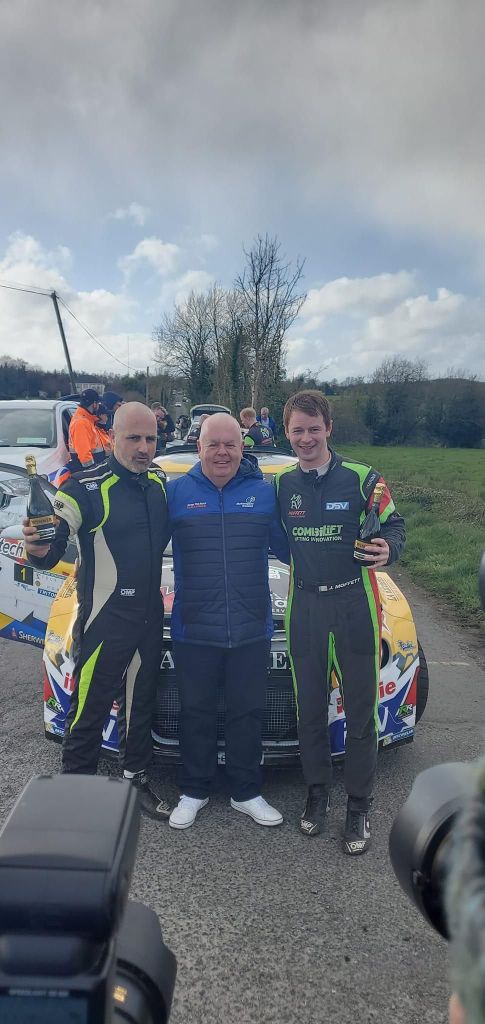 PHOTO CAPTION: Round two winners Josh Moffett and Keith Moriarty with Motorsport Ireland President Aiden Harper. Photo: Monaghan Motor Club