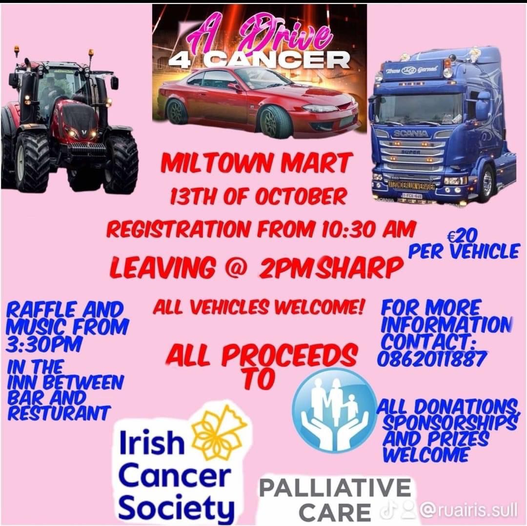 ‘Drive 4 Cancer’ is set to take place on Sunday at Milltown Mart to raise funds for the Irish Cancer Society and Palliative Care.