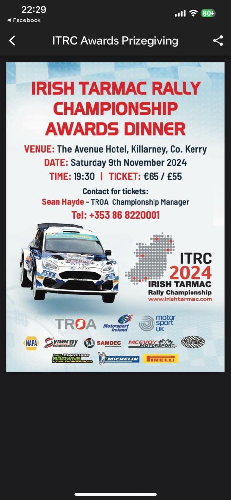 The Irish Tarmac Rally Championship (ITRC) is set to honour its top performers at the upcoming Awards Dinner on Saturday, November 9th, 2024.
