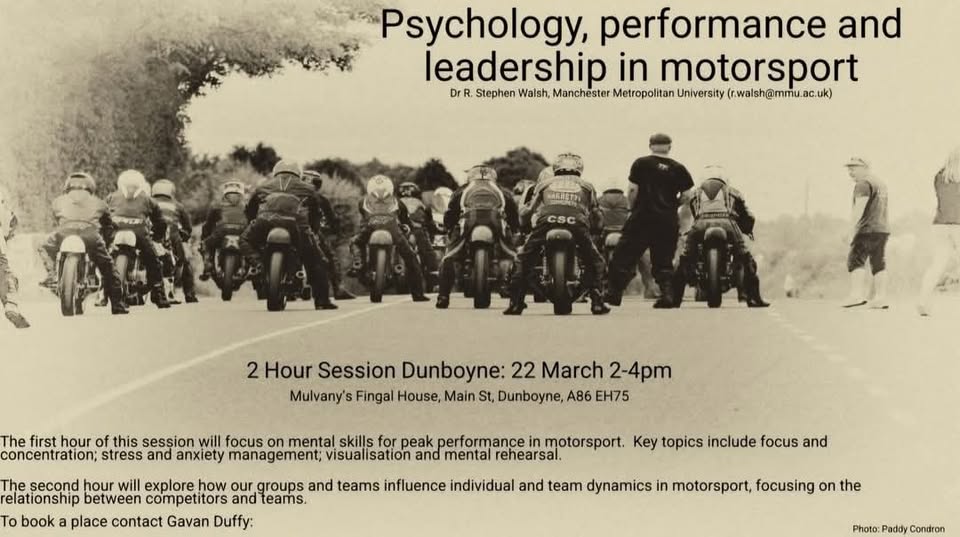 Last week, Dr. Walsh conducted a two-hour session at Mulvany’s Fingal House in Dunboyne, catering to a group of classic bike racing enthusiasts. The session covered key topics such as focus, concentration, stress and anxiety management, visualization, and mental rehearsal.