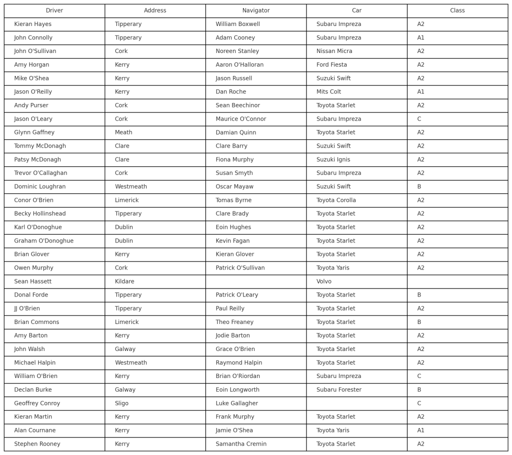 Other local entries include Amy Barton (Ford Fiesta), Mike O’Shea (Suzuki Swift),