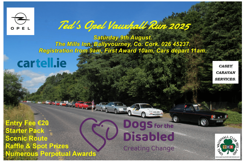 The 18th edition of Ted’s Opel Vauxhall Run will take place on Saturday, August 9, 2025, with the Mills Inn in Ballyvourney once again acting as the base for the event.