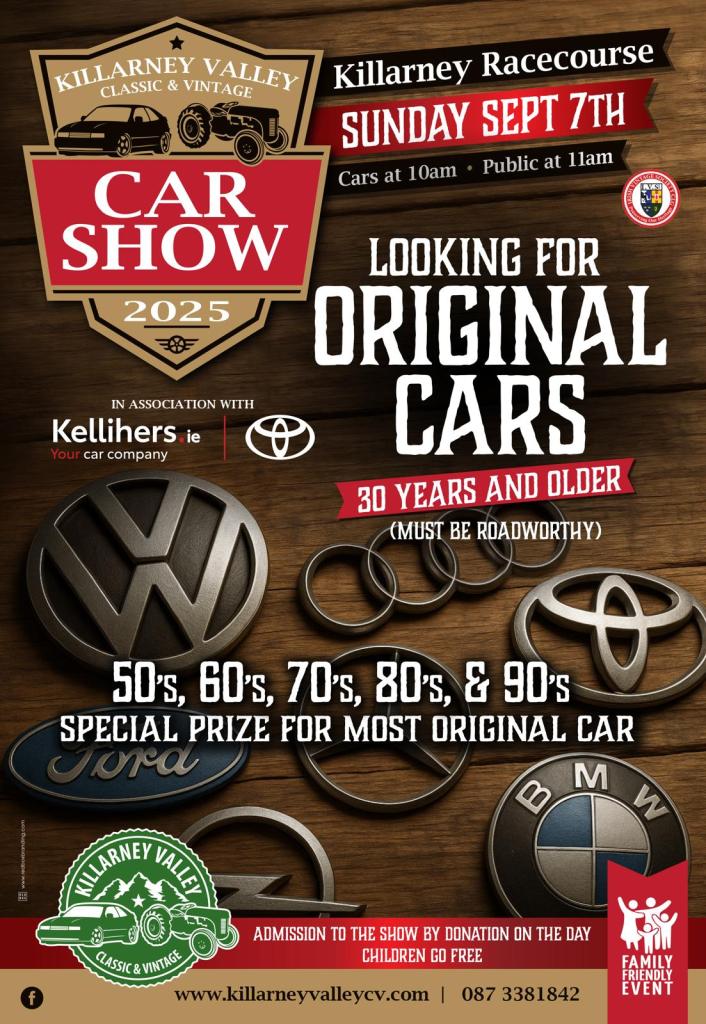 The event is presented in association with Kelliher’s Toyota. Further details are available at www.killarneyvalleycv.com or by phone at 087 3381842.