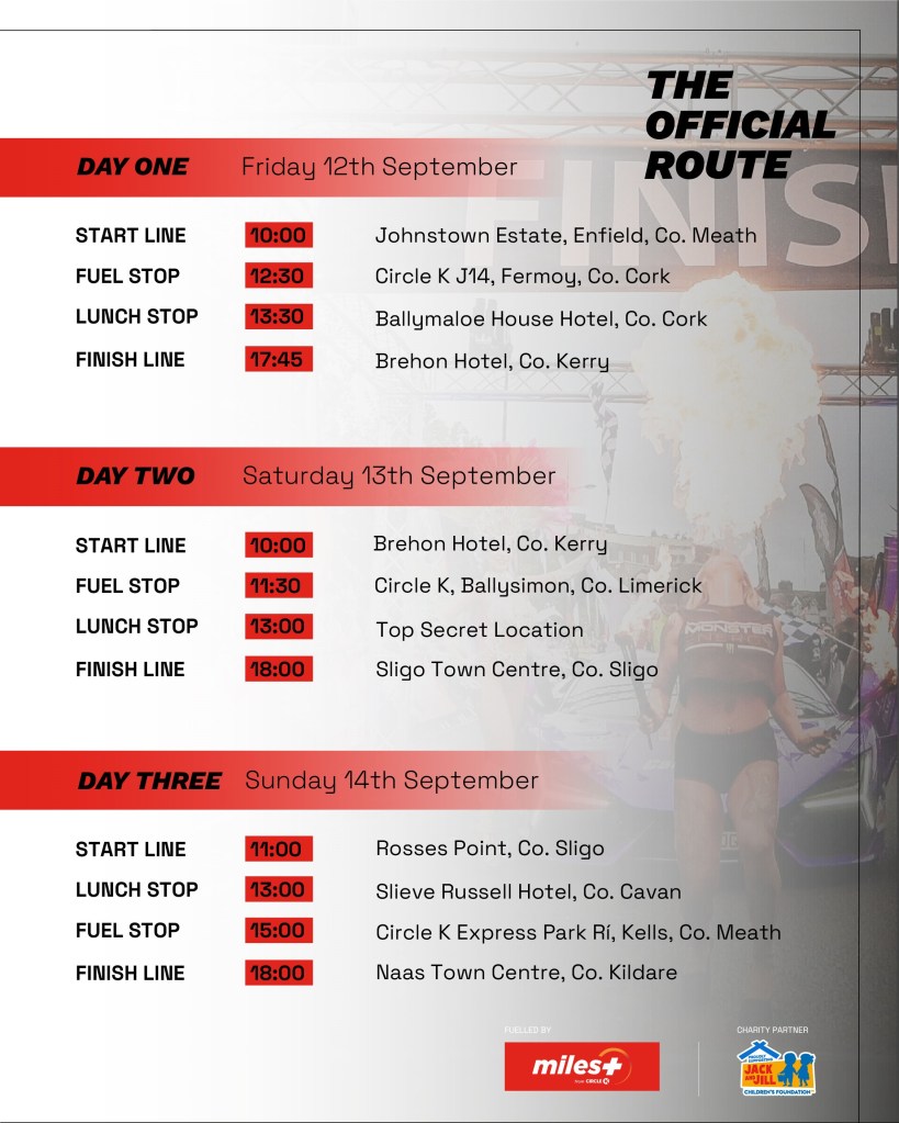 On Saturday, September 13, the convoy departs Killarney at 10am and will head for Circle K Ballysimon, Limerick, where it is due to stop for fuel at 11:30am before continuing north towards Sligo.