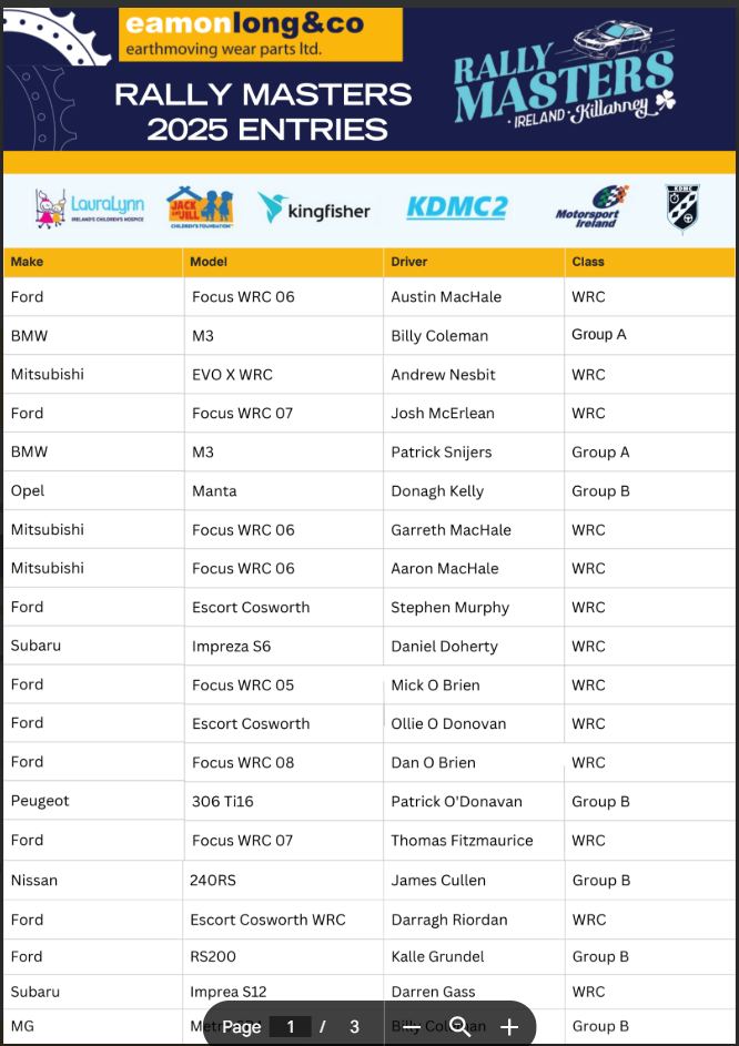 Killarney & District Motor Club has issued final spectator information for Rally Masters Killarney 2025, which takes place at Killarney Racecourse on Saturday, 27 September.
