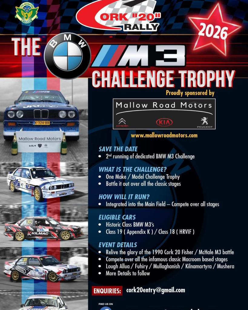 The 2026 edition will run over the classic roads that defined the rally for decades. Competitors will face Lough Allua, Fuhiry, Mullaghaglish, Kilnamartyra and Mushera – a full loop of the traditional Cork 20 tests.