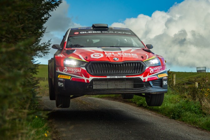 Jonathan Greer survived an impact on his Toyota’s front-left wheel after taking a cut on stage three, while Cathan McCourt had to stop and change a puncture, losing valuable time.